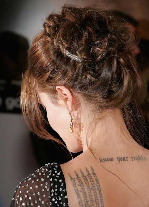 Angelina Jolie’s stylish pulled-back swooping and retro-inspired hairstyle has tons of teased volume and soft curly texture that beautifully show off her earrings. The messy hairstyle plus a shining hair pin looks luscious and exposes her wonderful tattoos at the back.