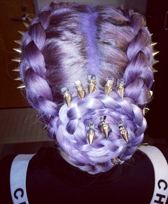 Kelly Osbourne’s risky cool retro-inspired braided up-do hairstyle dotted with many rivets offers people a gothic and punk effect. This risky hairstyle works better for pubs and holidays.