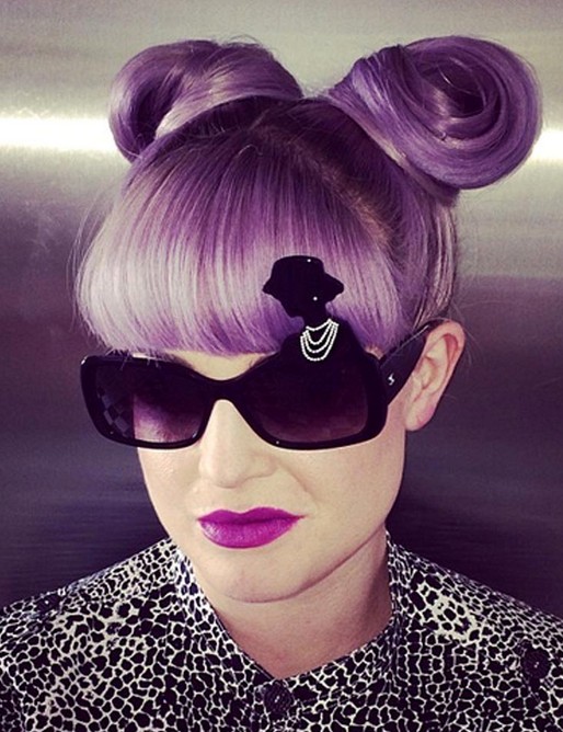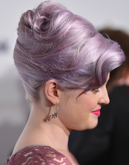 Kelly Osbourne sweeps her lilac-hued hair up into an elegant retro-inspired beehive. This voluminous hairstyle looks spectacular and glamorous and exposes her sexy neck. The bright pink lips contrasts wonderfully with the lavender hair tones.