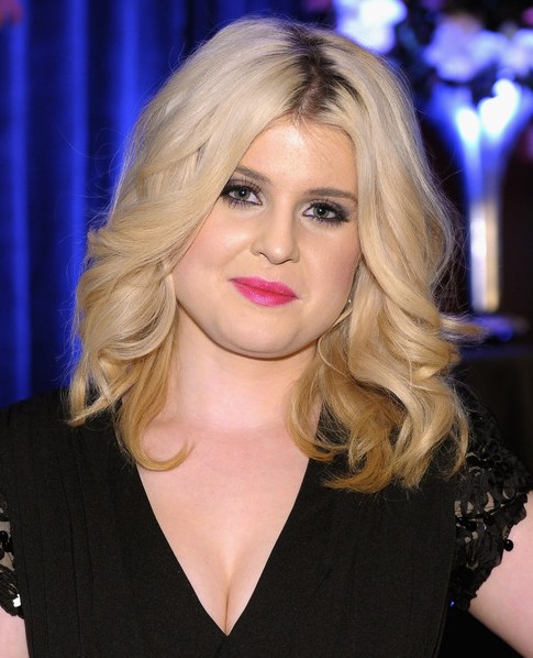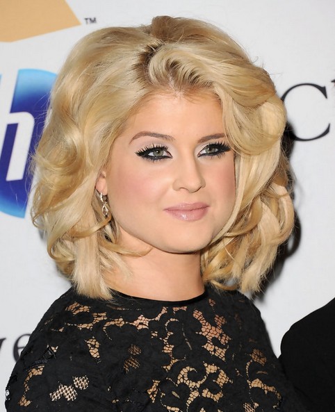 Kelly Osbourne’s feathered curly hair sits on her shoulders. The smoked eyes plus the satiny red lipstick pair her bright blond hair in a flattering way. The bouncy curls beginning from her cheek level, make her round face softer and longer.