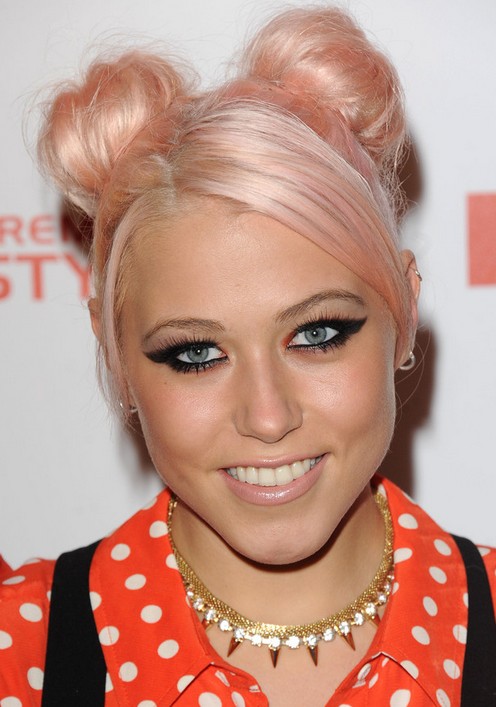 This is a super cute and cool double knot hairstyle. She divides her pink hair into two parts and then creates them into two high knots. The side swept bangs pair the hair knots wonderfully. Some hair pins can help keep the hair knots more durable. This lovely hairstyle is suitable for prom and parties.