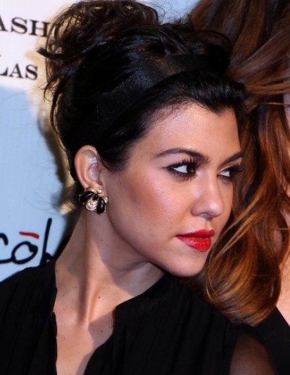 The Kourtney Kardashian updo hairstyle tips: Just style your hair curly. To create this, wet your hair and apply a sea salt spray or curling hair serum, next scrunch your hair and allow it dry naturally. You will get charming body curls. Next scoop all the hair back and tie it in a bun close to the crown. Then accompany an attracting headband to compliment the style.